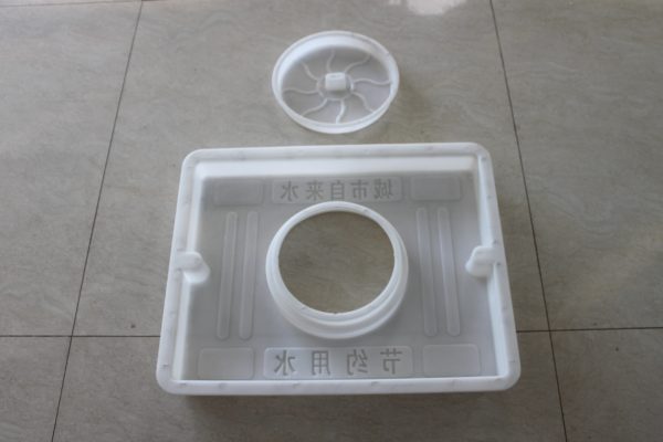 此水泥方井蓋模具采用聚丙烯樹脂經(jīng)注塑加工而成,模具兩端以小開口設(shè)計,以方便后期檢查時的位置移動。在方井蓋模具的表面加以防滑條及供水部門專屬字樣,即“節(jié)約用水”和“城市自來水”標(biāo)志。而在方井蓋模具的中間設(shè)立一個小型的圓孔蓋座,為日后水廠對于自來水管的檢查工作帶來更大便利。