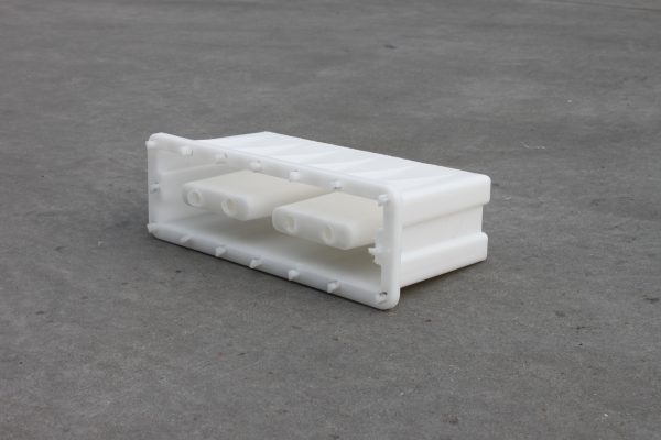 而這個塑料空心磚模具主要采用兩孔設計,因為水泥混凝土密度較重,在加上塑料材質的模具基本都具備一定韌性,填充量過多易導致模具膨脹使得水泥空心磚成品變形,所在模具四周均采用加強筋設計,對于防止這種情況的發(fā)生作用還是相當穩(wěn)定的。