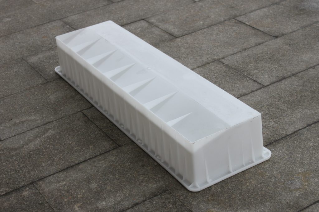 坡型設(shè)計(jì)的公路路牙石模具,其中路沿鋪設(shè)一邊呈小圓弧R2設(shè)計(jì),有效降低撞擊力度,減小破損幾率。由于此塑料路牙石模具規(guī)格較長(zhǎng),正好一米,在實(shí)際采用公路路牙石模具澆筑水泥路牙石時(shí)所受水泥混凝土壓力較大,所以在塑料模具四周均采用加強(qiáng)筋加固,防止膨脹變形。