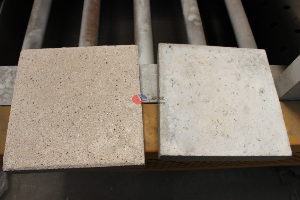 1.先使用塑料模具來澆筑成型的混凝土彩磚,對于預(yù)制成型的混凝土彩磚進(jìn)行模具的脫模,放置一旁得以備用,下面這張圖是主要能更清楚的看出使用混凝土路面拋丸機(jī)后的水泥磚表面。